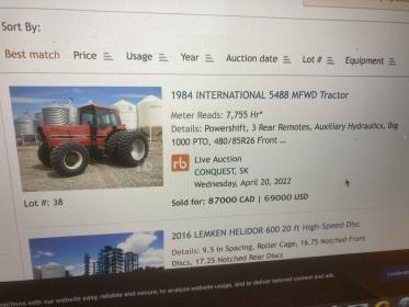 CaseIH 7240 with 3400 hrs sold in a Premier auction near Camrose last week for $140000. Would still been a better deal than the 5488 but not the same money. There still are some smaller auction companies in AB including Doug Johnson, Premier, Prodaniuk, and Dunkle Auctions.Originally posted by Old Cowzilla View PostYou could buy a magnum for that kind of money and have twice the tractor.