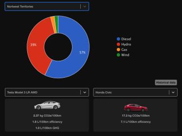 But if your chart is to be believed. Then taking into account the roughly 40% hydro and solar in Northwest Territories, burning diesel fuel in a diesel generator, transmitting that energy, charging and discharging etc is about four and a half times more efficient than burning gasoline in a car directly.