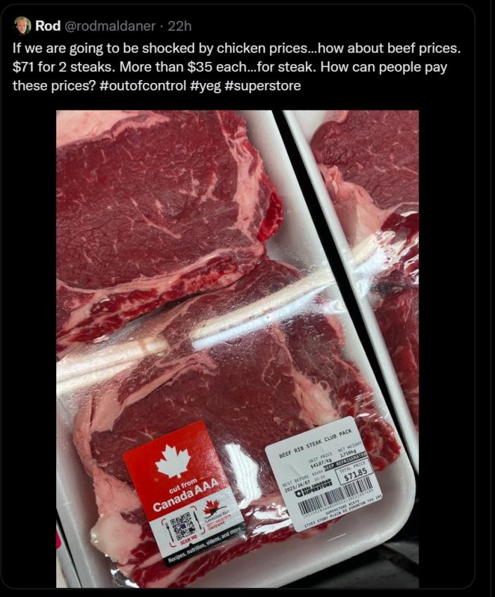 Looks like grocery retailers in canuckistan are screwing around at the meat counter and marking things up. Then when it doesn't sell, they reduce the price. Just checked the freezer and my wife has picked up meat with two discount tags on it. There is one small steak there that cost $4.38 for 0.332 Kg from the local no frills or 13.19/kg vs the $41/kg shown here. We also get beef direct from farm as well so the freezer is fairly full most of the time. I strongly suspect the feds are encouraging this behavior. Keeping the freezer full of home raised or local beef is critical at this time.