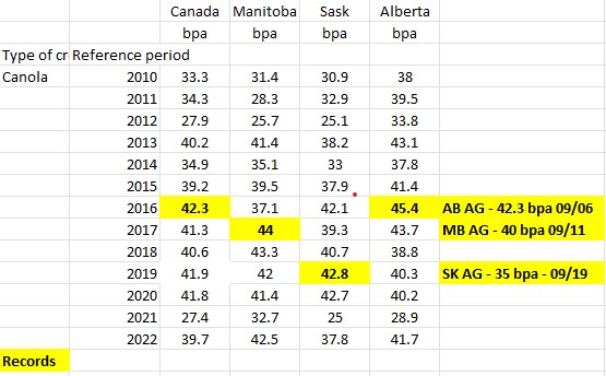 60 bpa canola is tossed around like it is normal - it has never been normal.Originally posted by LWeber View PostHere are the record yields set for Canada and three main canola provinces via STATSCAN
