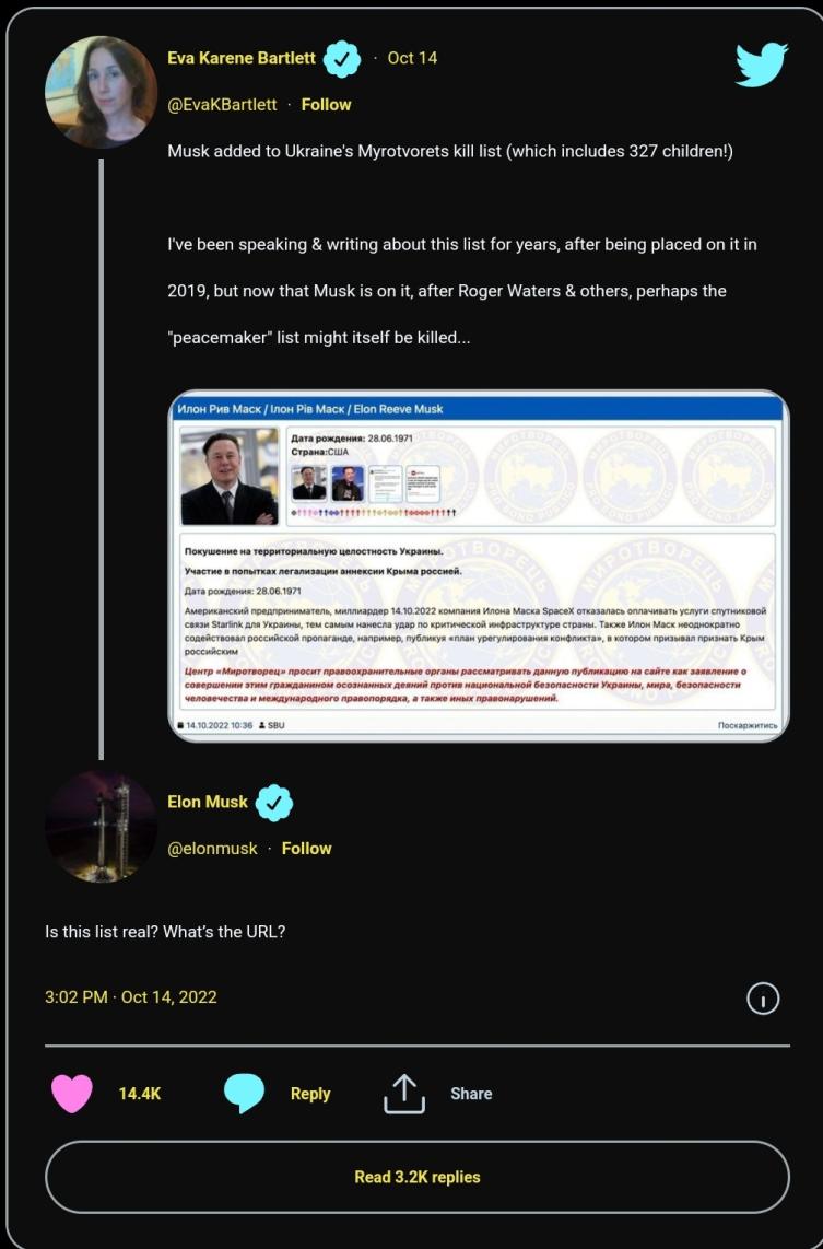 Musk's latest tweet.Originally posted by biglentil View PostElon "concerned" he was added to a Ukrainian kill list. We send billions to those that maintain a kill list for those that want peace. I bet Elon did Knot-Zee that coming. Full article: https://www.zerohedge.com/political/...nian-kill-list