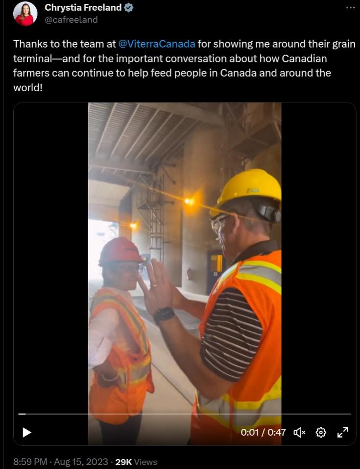 Boy things must be really bad behind the scenes. Freeland visited a grain terminal and a gas plant all in the same week.