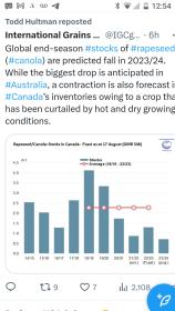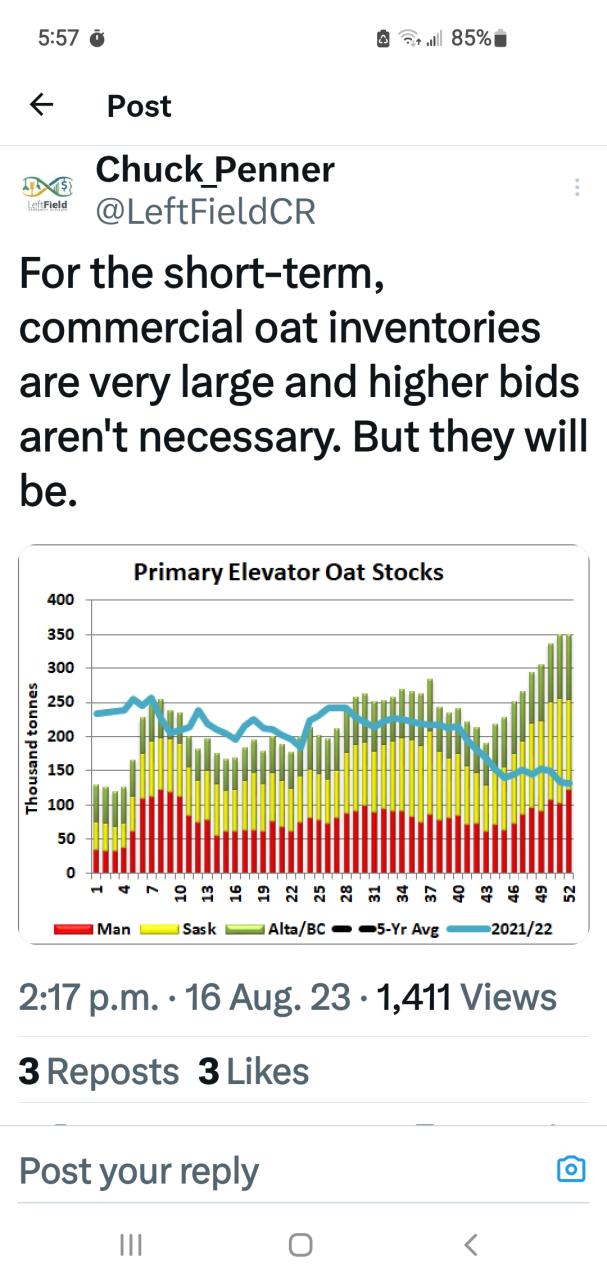 Even with adequate rainfall cereal crops here will be averaged at best. Doing yield assessments and looking like wheat will be off by 20% anyways. Oats are terrible to the tune of 50%. Canola I’m cautiously optimistic but asters are present so it will impact yields.