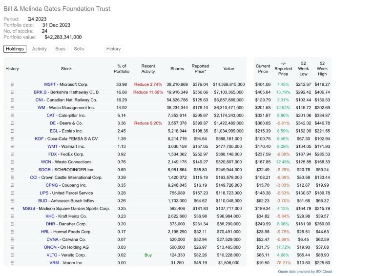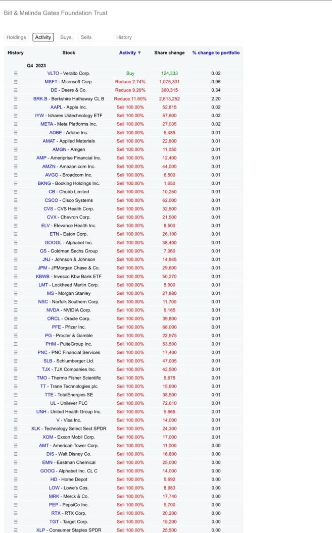 [url]https://twitter.com/TheLongInvest/status/1758996697953235196/photo/1[/url] The source that that website links to is screenshots on a twitter post showing the foundation sold 2.74% of their microsoft holdings, 9.2% of their deere holdings, 11.6% of their berkshire hathaway holdings, and 100% of quite a slew of relatively tiny holdings. Check out the second picture which shows a number of larger holdings that were untouched. The sales, if you add up the % change to portfolio column on the far right, add up to... (drumroll, please....) about 4.47% of the total portfolio.