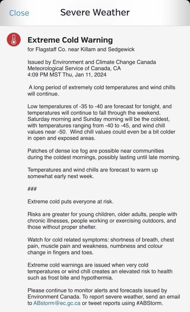 Start of day one of the two known coldest days in Vegreville history. Previous record was -46.9 on January 27, 2004. Weather records do not support that winters were colder in the past, it is technology that makes them easier to deal with. (Thank God for oil, natural gas, and coal) We have in recent history had extreme conditions that has rivaled anything in past weather records that I can find going back to the 1920's. Ice age?