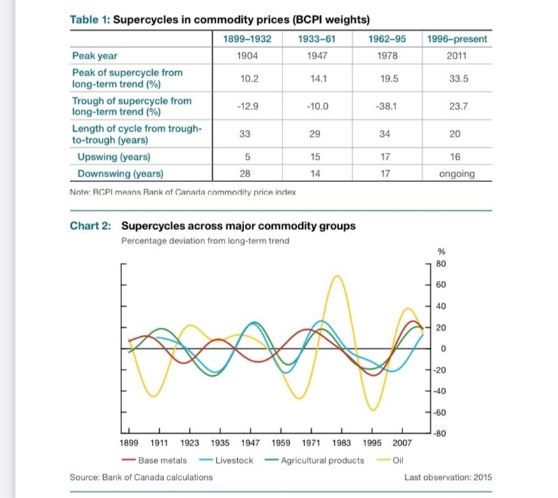 Another marketing related chart. This chart on commodity supercycles was posted on newagtalk, from the bank of Canada.