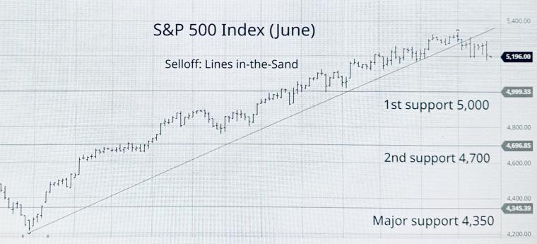 S&P 500 Index technical lines in-the-sand should stock market correction intensify. 1st key support seen at 5,000 pts, down 6% from recent all-time highs. 2nd support seen at 4,700 pts, a 12% pullback. Major support on full-blown correction fills-the-gap at 4,350 pts, down 18%.