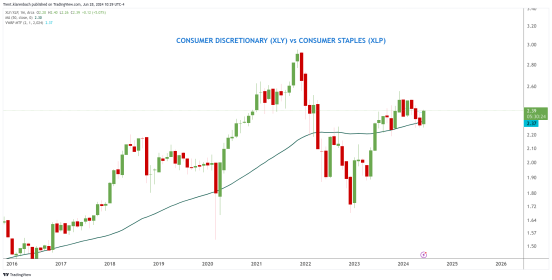 One measurement method is the Consumer Discretionary ETF (XLY) vs Consumer Staples ETF (XLP) ratio chart.