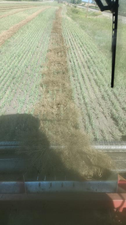 It went 17 bu/acre, 1% green, moisture tests ranged from 5.5 to 8.5 at the elevator while harvesting. There are quite a few sprouts from heat stress/hormones and the front hopper (worst part of the field for heat blast) was heating. Hot to the touch and stunk.