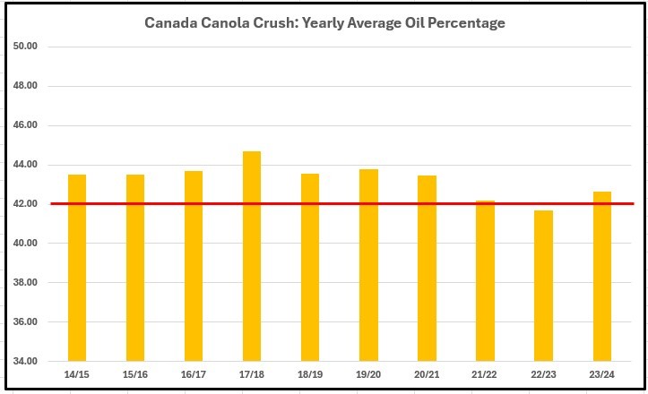And there is this gem: The oil content of Canadian canola meal tends to be relatively high at 3.5% compared with 1–2% oil content in canola meals produced in most other countries. (SCIENCE DIRECT - 2016)