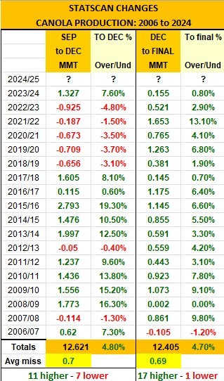 Because STATSCAN can change production for up to 2 years after the December report and up to 5 years in an Ag Census year, production estimates can change unless the data is older than 5 years. The chart shows two periods - September to December changes and then December to the final. September to December estimates have increased 11 out of 18 years and gone down for 7. The final final has only gone down in one year out of 18. The average miss in 18 years is 700,000 MT from Sep to Dec and 690,000 MT from Dec to the final. Their accuracy is the same today with computing power as with paper and pen, 40 years ago. Their inaccuracy is not a hill to die on, as every green number displayed in the chart has underestimated the crop and held prices higher; however, most traders are keeping their own set of S&Ds.Originally posted by LEP View Post