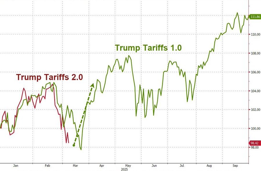 "It shows the S&P 500 2018-19 during the first Trump Trade War in green vs. S&P 500 2025 during Trump Trade War 2.0 in red."