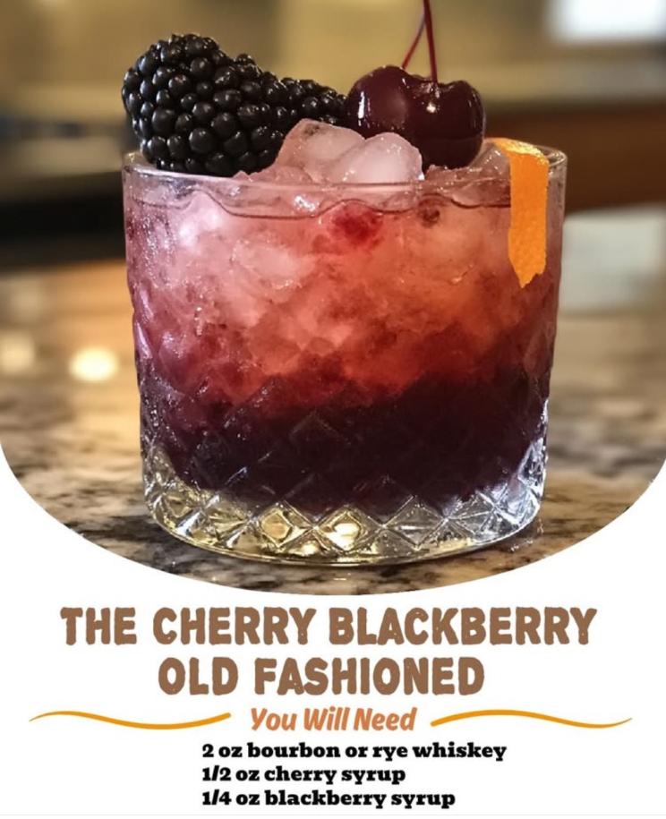 In a mixing glass filled with ice, combine the bourbon, cherry syrup, blackberry syrup, simple syrup, and bitters.