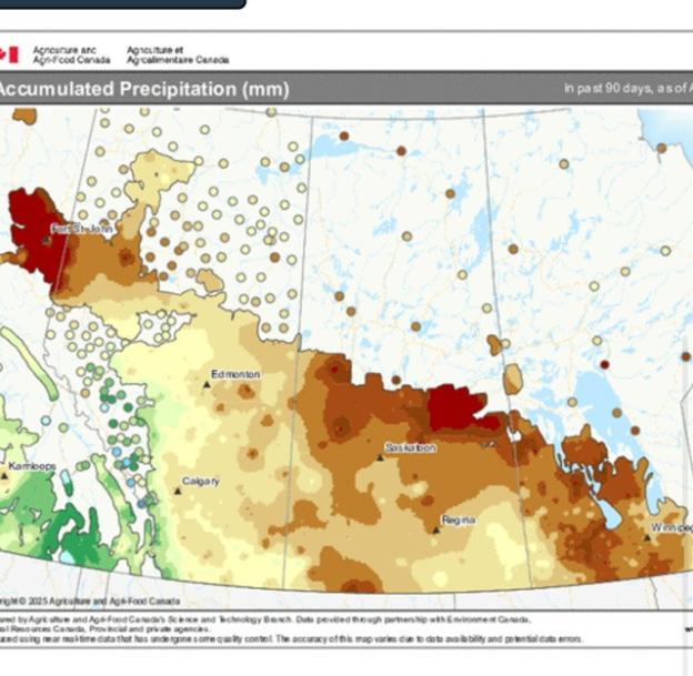 We are starting to get dry on the surface here east of Edmonton as well. Thanks to snow fall, the water cannons have been busy, but now when it would be useful, nada. Snow is really useless other than to fill dugouts. There is some reserve so now it is a matter of getting the crop started so it can root down.