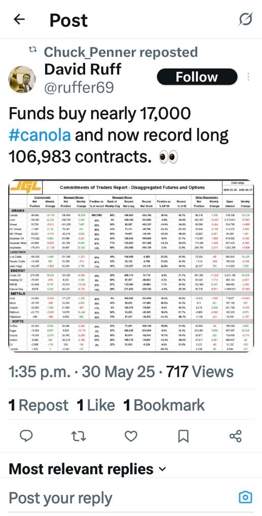 Hahhaah that whole chicken before the egg thing... we can get 15.20 for september canola up here... great starting point. But crops currently look like they could run 15 bpa. If we get some rain in the next week? 50 to 70!