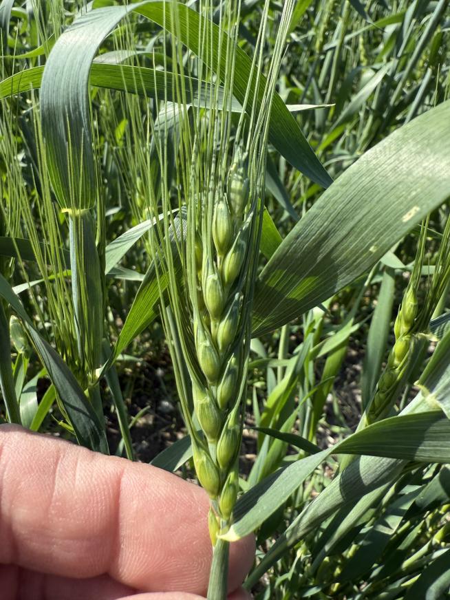 Hrs and Durum are at the flag stage or close. No heading yet. Rows are closing in. Leaf mass is like other years so early dryness might take away from top yield. Head size is determined at the three to four-leaf stage. Spraying is done and guys will apply fungicide wheat in our area.