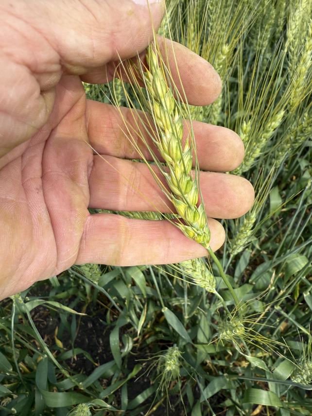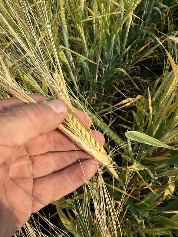 Wheat and Durum are filling but some rows won't fill to their potential. Different colour spots from poor areas are showing up. We needed one food rain this week to keep this one moving forward, now it's just fill to its best and next year. Some fields seeded end of April are starting to change slowly in colour.