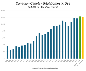 Agriculture and Agri-Food Canada (AAFC) is currently projecting total domestic use of canola will hit 12.226 million metric tons (mmt) in 2025-26 compared to the previous record of 11.698 mmt set in 2023-24. Just how impressive that is really comes into focus when you compare it to 2001-02 when only 2.558 mmt of the canola crop was used domestically.