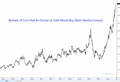 Looking at canola for my Canadian followers, it is obviously not much better. An ounce of gold can now buy over 6.5 metric tons (mt) of canola compared to just 1.6 mt in early 2022. Comparing bad apples to bad apples, the least value seen in gold terms was in early 2020 when just over 4 mt of canola could be purchased with an ounce of gold.