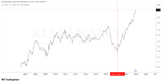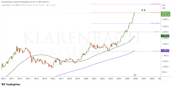 Gold closed the month and year at the 2.168 Fibonacci Extension, which is consistent with Elliott Wave Theory.