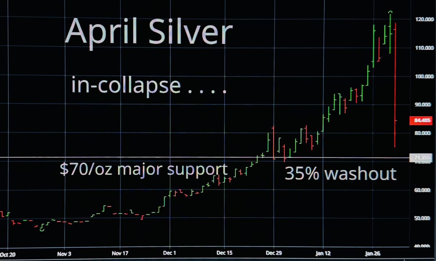 SILVER COLLAPSE . . . Highly volatile and unpredictable, but technically major support for silver seen approaching $70 per oz.