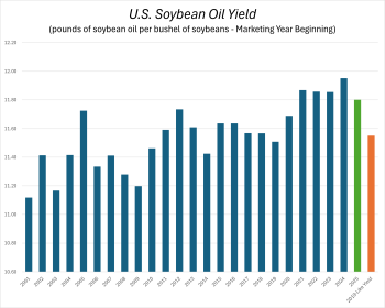 When 2.555 billion bushels (bb) of soybeans are crushed in one year (an important record of its own), the soybean oil yield can really make a difference to total production. With it being just as it sounds -- pounds of soybean oil produced per bushel of soybeans crushed -- it doesn't get a great deal of attention. Until it matters, that is, and early indications are suggesting that it might matter this year.