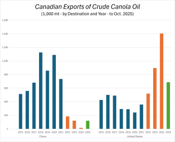 Getting back to the trade deal, canola meal exports are the second most important beneficiary. China had a growing appetite for Canadian canola meal up until 2025's tariff surprise with nearly 2 mmt of imports seen in the three previous years. That total fell to only 736,000 metric tons (mt) in 2025 (as of the end of October) with most of that business being done early in the year. For comparison, the U.S. is the top destination with just under 3.5 mmt in exports being the normal over the past decade. So, a return to tariff-free trade in canola meal will certainly be welcomed by the canola crushing industry.