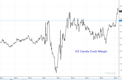 And it's not just canola. Soybean crush margins are close to setting records themselves -- topping $3/bushel compared to less than $1.30/bushel just this past October and the previous spike record high of $3.10/bushel set very briefly in the fall of 2022. The normal soybean crush margin range prior to Covid was $.60 to $1.80/bushel with $.80 to $2.20/bushel more common over the past five years.