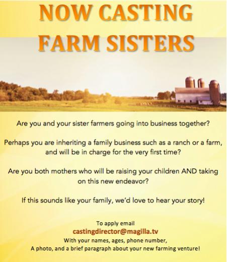 My name is Kate and I’m with a TV production company in NYC that is currently developing a new show based around sisters who are either starting a small ranch or farm together, currently running one or are taking over a family farm or ranch!