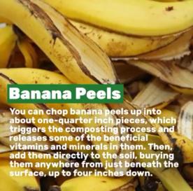 आप केले के छिलके को लगà¤à¤— à¤à¤•-चौथाई इंच टà¥à¤•ड़ों में काट सकते हैं, जो कंपोसà¥à¤Ÿà¤¿à¤‚ग पà¥à¤°à¤•à¥à¤°à¤¿à¤¯à¤¾ को टà¥à¤°à¤¿à¤—र करते हैं और उनमें से कà¥à¤› फायदेमंद विटामिन और खनिजों को छोड़ देते हैं। फिर, उनà¥à¤¹à¥‡à¤‚ सीधे मिटà¥à¤Ÿà¥€ में जोड़ें, उनà¥à¤¹à¥‡à¤‚ सतह के नीचे से चार इंच तक, कहीं à¤à¥€ दफनाना।