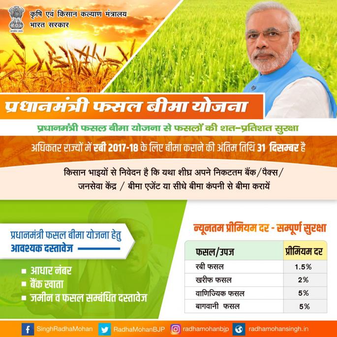 Talking to the Millennium Post, Radha Mohan Singh said that the Ministry of Agriculture will soon get approval from Finance Ministry for suggestions on crop insurance. The minister said, "The objective of making a change in crop insurance is to ensure timely payment of claims to the farmers. The government will also encourage states to pay premiums prematurely."