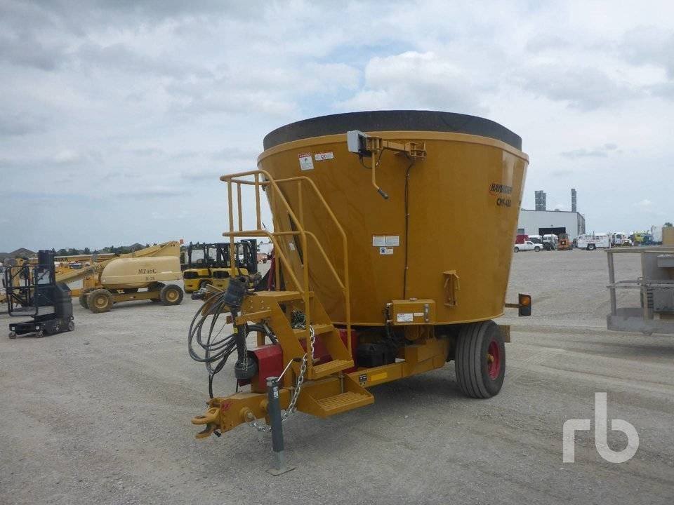 A 2014 Haybuster CMF-430 vertical mixer bale processor sold for $23,500 USD ($29,490 CAD).
