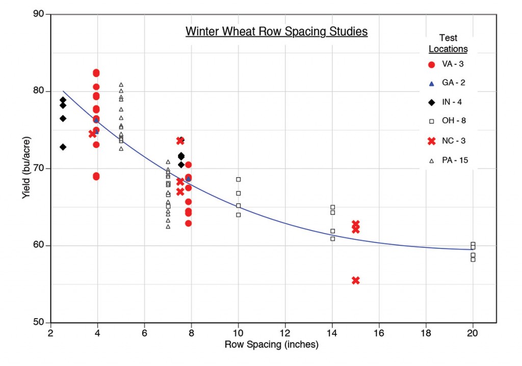 They originally were 40 inch spacing because that was the width of a horse, then 30 because that would accommodate most tractor tires. But most progressive farmers and researchers know that narrow spacing is the key to better yields.