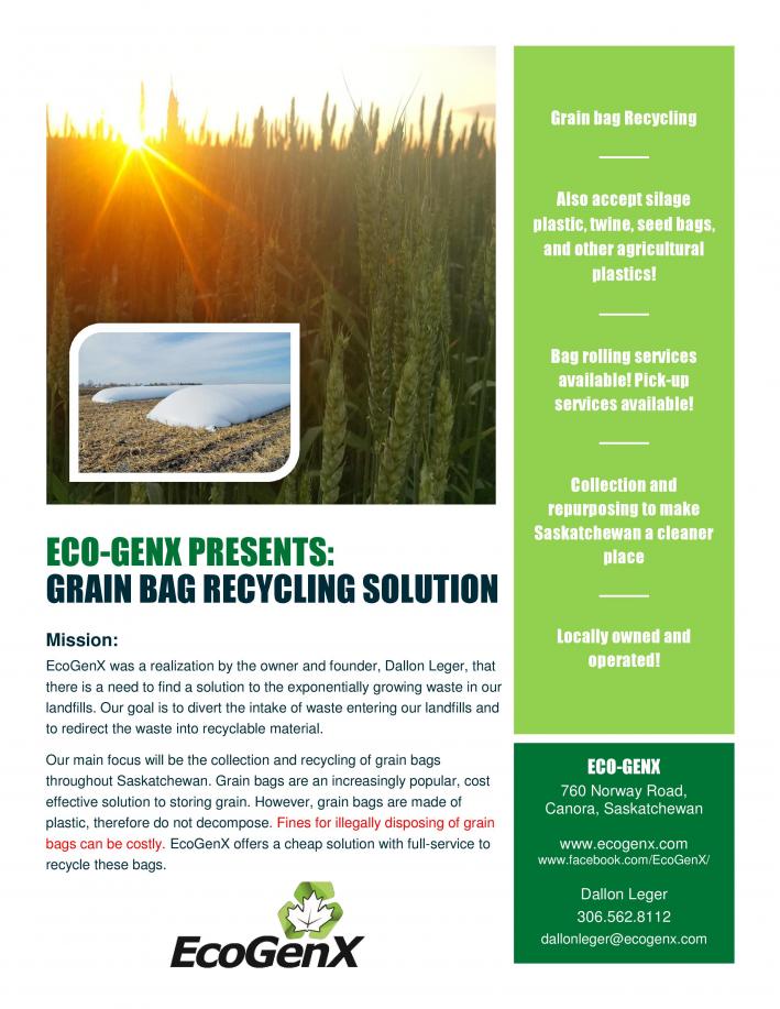 Environmental sustainability and accountability has been discussed for years, but is quickly gaining awareness among farming households. EcoGenX was created by a fellow farmer, Dallon Leger, who fostered the idea for an entrepreneurship opportunity when searching for an environmentally friendly, but also convenient way to recycle his used grain bags instead of the conventional dumping method.