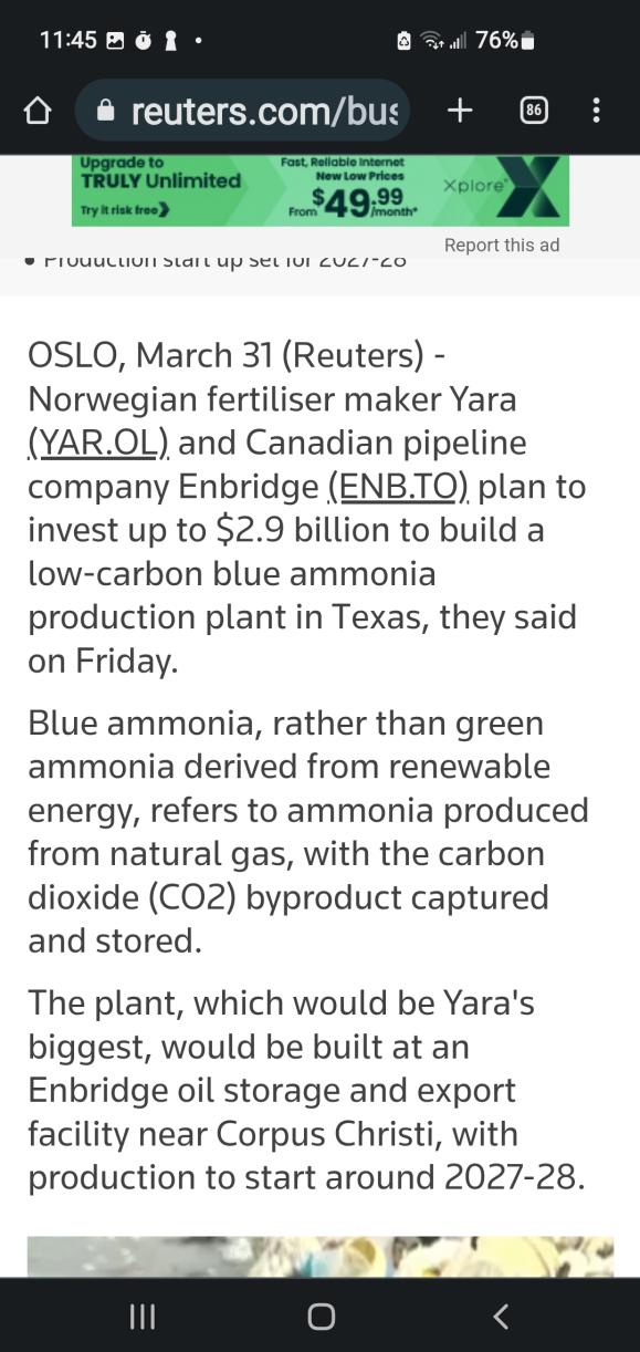 Screw the power lines to the cities. Turn these intermittent sources into hydrogen and then to ammonia. It apparently takes a ton of gas and electricity to make ammonia the hauber-Bosch way and these new solar-wind ones are supposed to be more efficient and less energy intense. How many tonnes of ammonia gets made from a quarter of panels and windmills? The ammonia is made in the place where it’s needed. Less transportation, zero emissions, no need for transmission lines. Kind of a win win. Down the road when hydrogen engines show up there’s a ready fuel source in the country. See there Chuck I can brainstorm and not be an asshole.