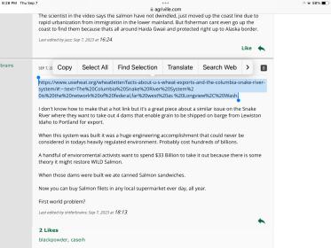I don't know how to make that a hot link but it's a great piece about a similar issue on the Snake River where they want to take out 4 dams that enable grain to be shipped on barge from Lewiston Idaho to Portland for export.