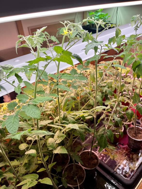 My tomatoes are flowering. But the temperatures aren’t cooperating to move them outside.