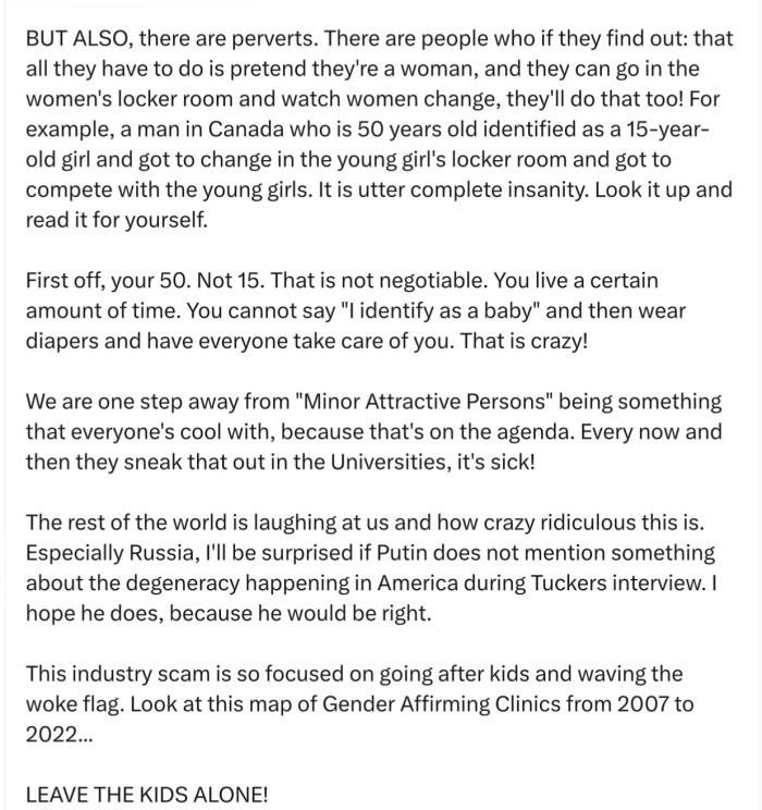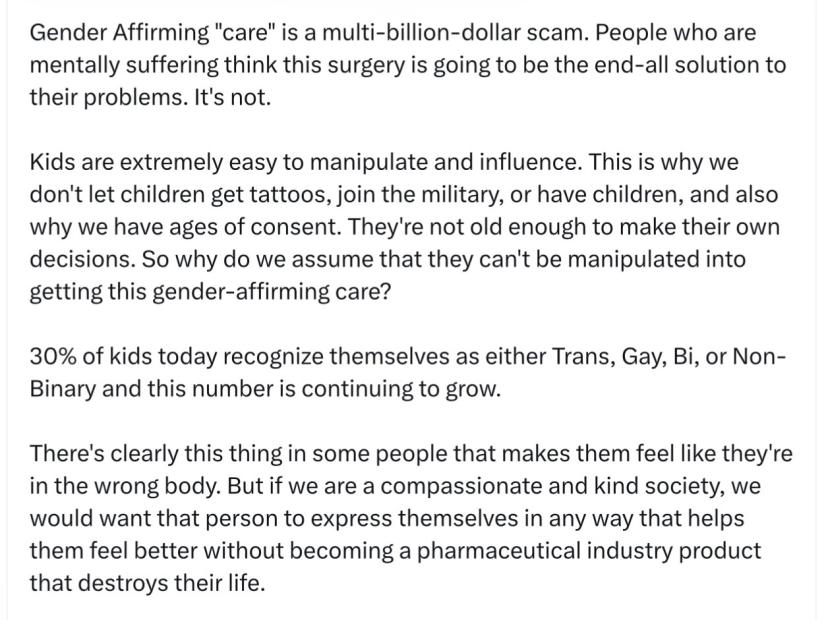 Top surgeries on minors – a double mastectomy – is obviously controversial. But WPATH says it is a proven and safe treatment for gender dysphoria. It’s fair to be concerned about this radical procedure for minors; banning it because a politician is uncomfortable with it is not.