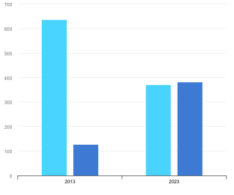Solar is in light blue oil is dark blue 2013 vs 2023 in Billions of USD