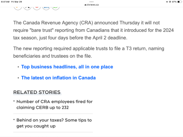 New reporting rules this tax year. Applies to parent child arrangements for mortgages and accounts. There was a blurb on Global news. April 2 deadline. Penalties for non filing T3 may not kick in this year.