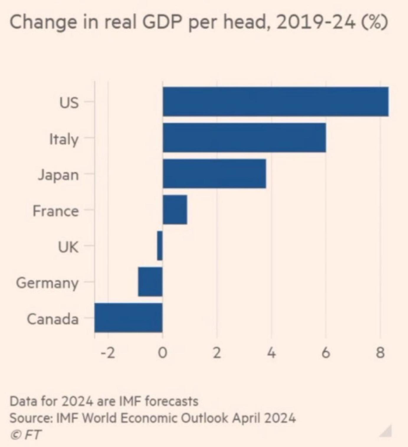 This, too, has been cited as a problem in itself – that the immigrants Canada is bringing in lower the country’s GDP per capita instead of raising it. Even if that is so, though, the fact remains that the numbers do not reflect some calamitous drop in living standards. Combining headwinds in the economy with a swelling population inevitably lowers GDP per capita.