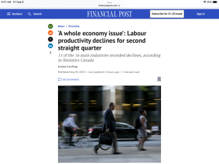 Poor labour productivity wouldn't have anything to do with the fact that 1/4 of the workforce now works for the government, which doesn't produce anything. And growing at a 5% annual rate. Growing 8 times faster than private sector employment.