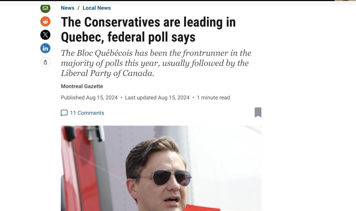 As of September 15th, 338 Canada which tracks numerous polls and not just one has the Bloc at 33%, Liberals at 26%, Conservatives 24%, NDP 11%.
