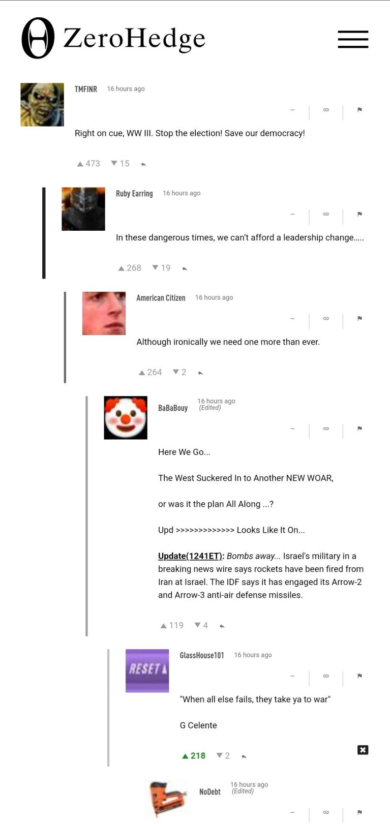 Question is chicken or egg? Maybe it’s a globalist conspiracy amongst power players or little worms in your head to get the democrats elected or perhaps the Middle East and radical Islam is an eternal state of war and misery. Aside from conspiracy theories look at consequences for Iran becoming involved in a conflict with Israel. Does it hamper their ability to supply arms to Russia? Does it justify Israel to take out irans major oil export hub? What are the repercussions and who stands to benefit or not from that? Not likely this will escalate beyond Israel lobbing a similarly weighted response at Iran and things carry on as usual. The Iranian regime prefers to yap but pay others to do the dirty work.