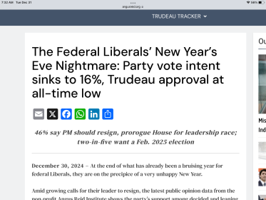 A new Angus Reid poll is out and Justin Trudeau is pushing the Federal Liberal’s to an all time low at 16% among decided voters! The longer he sticks around the worse it gets. As a side benefit Jagmeet Singh’s personal approval rating continues to slide. I hope that in 2025 both become part of Canada’s political history! Happy New Year to all!!