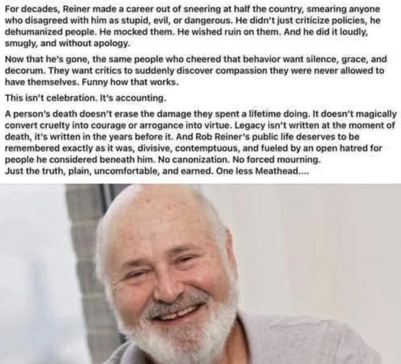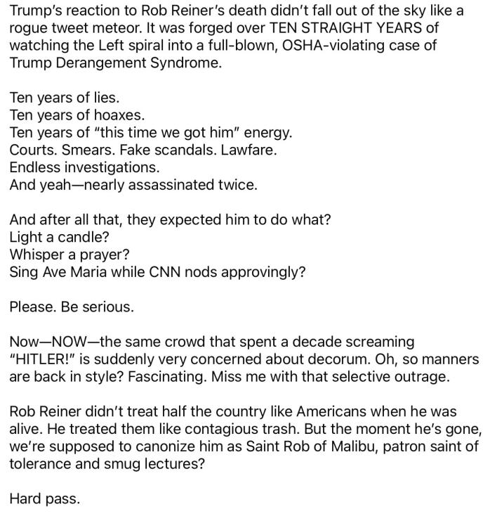 My opinion , and why Trump can have his opinion ,put yourself in Trumps shoes , yes after 10 years of harassment from the bitter hateful left he gets a pass , do you forage agree with everything reiner has said in his lifetime ? where is the huge number of people all over the internet celebrating like what happened when C Kirk was murdered ? looks like you too need treatment for TDS forage