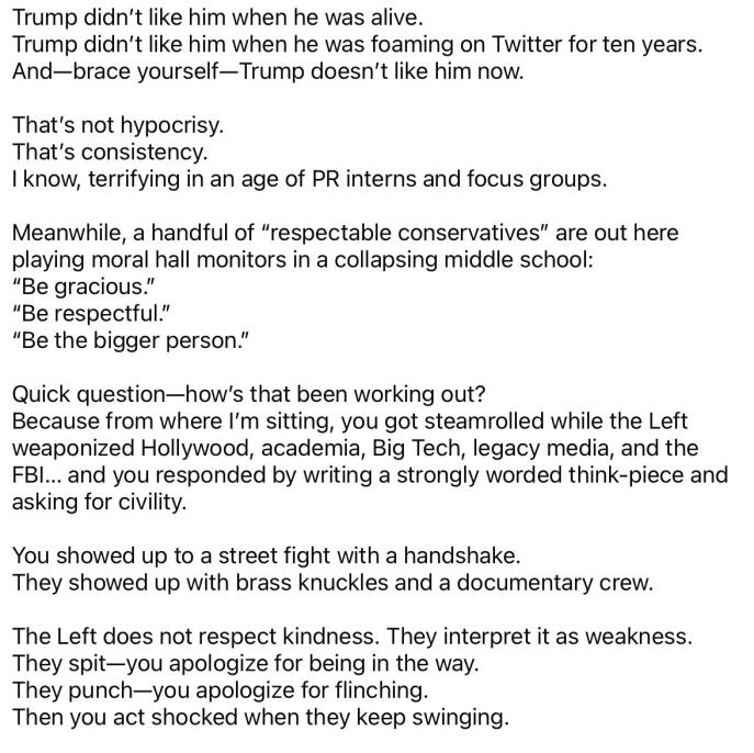 Trump has bad mouthed almost everyone handicapped veterans political rivals etc. He has made a political career of calling people names . Would you expect anyone to praise him. He has earned every criticism. It is beneath his political office to bad mouth someone in death. No one should speak well of him when his time comes. He has only cared about one person , himself. Reiner. even gave condolences to Kirk and his family.