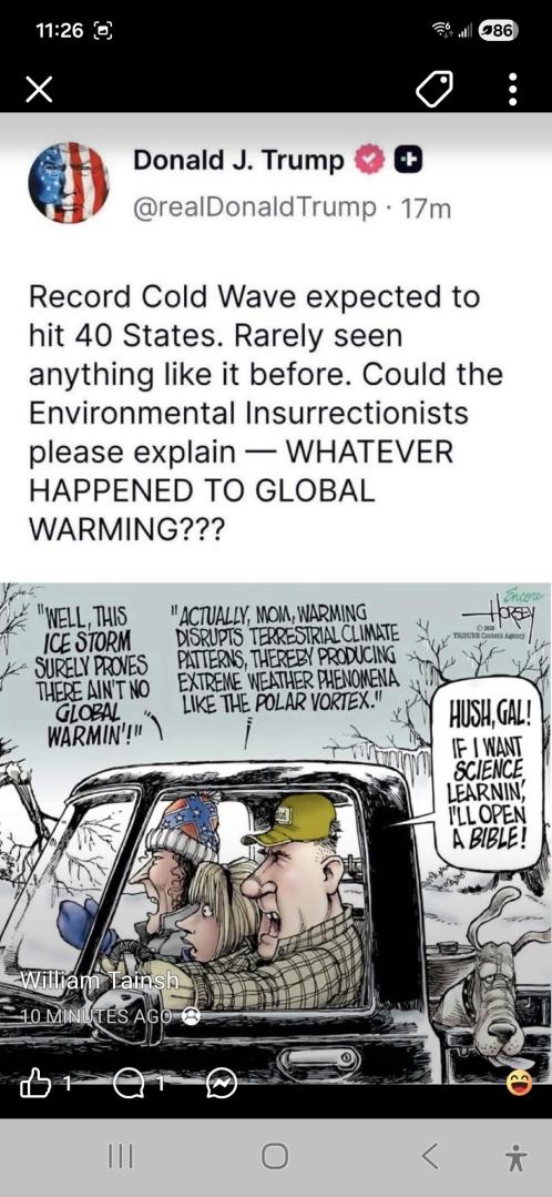 Just look at how many posts the statistically challenged Chuck and Friends make about extreme weather.Last edited by AlbertaFarmer5; Jan 24, 2026, 12:24.