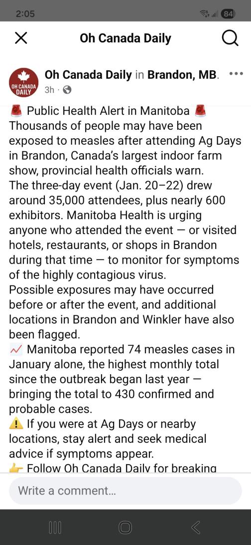 Manitoba Ag Days was a super Spreaders for measles. Government warning for anyone who attended.